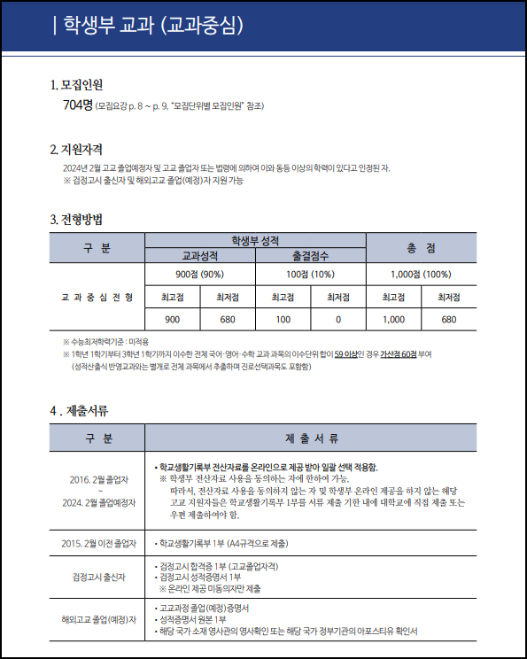 정원 내 선발 안에서도 학생부 교과와 학생부 종합으로 나뉘어있습니다.